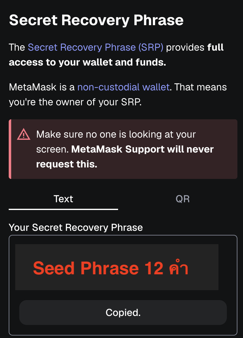 MetaMask จะแสดง Seed Phrase 12 คำ อย่าให้ใครเห็นหน้าจอนี้