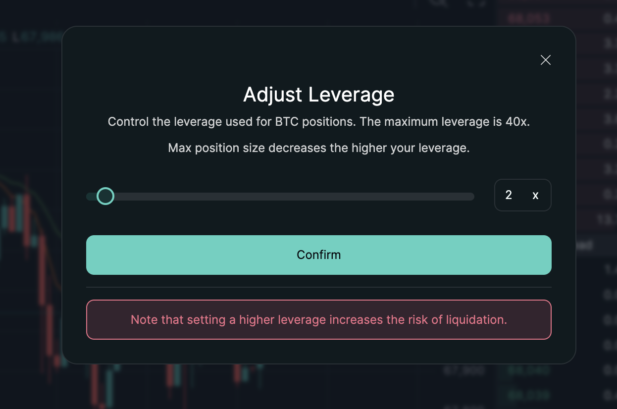 Leverage: ยืมเงินจากแพลตฟอร์มเพื่อขยาย position (เช่น 5x = ทุน $100 เทรดได้ $500) แต่ถ้าขาดทุนก็ขยายตาม Hyperliquid รองรับสูงถึง 40x แต่ มือใหม่ควรเริ่ม 2x-5x เพื่อลดเสี่ยง liquidation