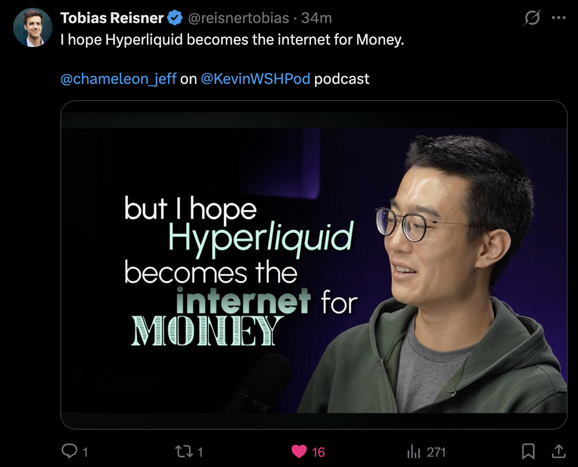 Jeff เป็นที่รู้จักในฐานะนักลงทุนและผู้สนับสนุน DeFi ที่มีวิสัยทัศน์กว้างไกล การเปรียบเทียบ Hyperliquid กับ "Internet for Money" สะท้อนถึงความเชื่อว่า Hyperliquid จะเป็นโครงสร้างพื้นฐานที่ทุกคนใช้เงินผ่านมัน เหมือนที่เราใช้ HTTP สำหรับข้อมูล