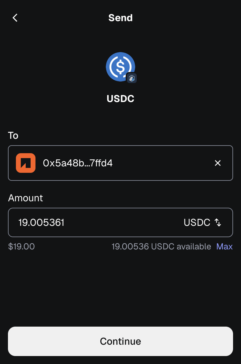 6.4 ในช่อง To ให้วาง Address ที่คุณ COPY มาจาก Bitkub และ ระบุ Amount ที่ต้องการโอน (เช่น 19 USDC) แล้วคลิก "Continue"