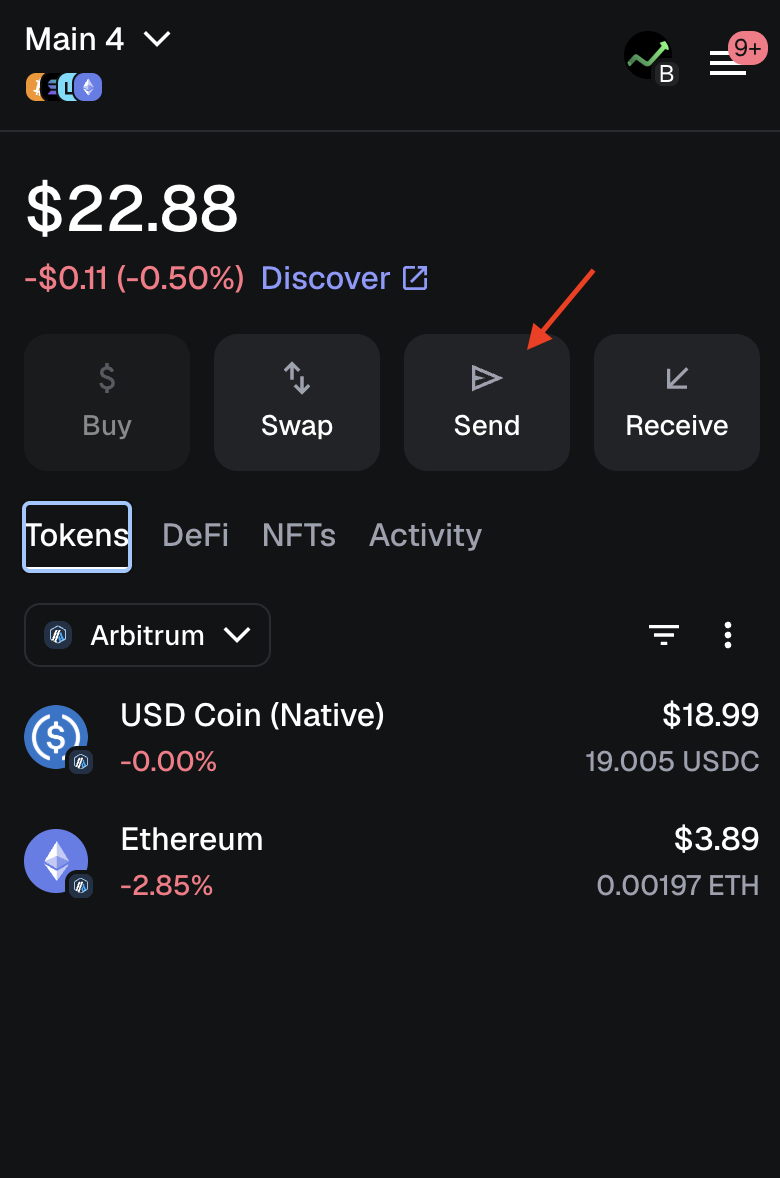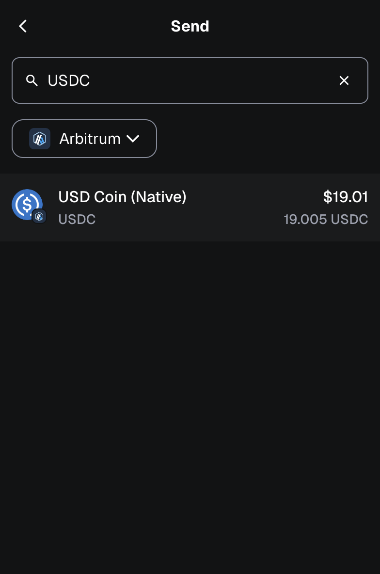 6.3 ในช่อง search ให้ใส่ USDC และเลือก Network เป็น Arbitrum จากนั้นคลิก USDC ที่ขึ้นมา สังเกตจะมีจำนวน USDC ที่คุณถอนมาจาก Hyperliquid แสดงอยู่